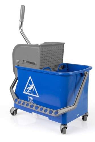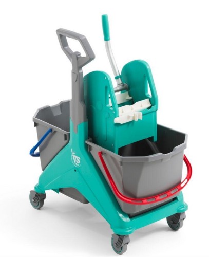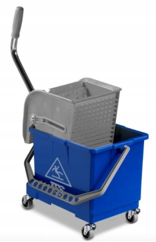 wiadra dwukomorowe z wyciskaczem – umożliwiają oddzielenie wody czystej od brudnej, co zwiększa higienę i skuteczność sprzątania,