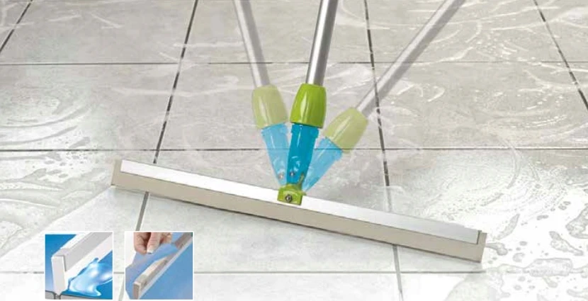 Prezentowany zestaw sprawdzi się w wielu sytuacjach; może posłużyć nam jako zbierak/ ściągaczka do zbierania wody z posadzek, jako mop do mycia podłóg, jak również może przyjąć np. funkcję zmywaka do kafelek ściennych.