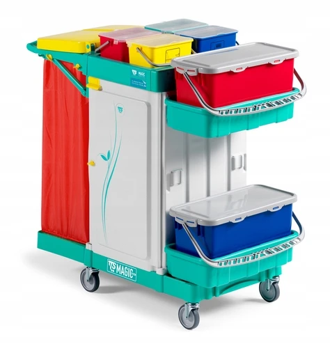 Wielofunkcyjny wózek MAGIC SYSTEM 700 SAFETY przeznaczony jest do utrzymania czystości i idealnie sprawdzi się w obiektach takich jak: hotele, galerie, placówki medyczne, pomieszczenia biurowe itp. Modułowe komponenty pozwalają dopasować wózek do każdej potrzeby. Wózek wykonany jest z polipropylenu.